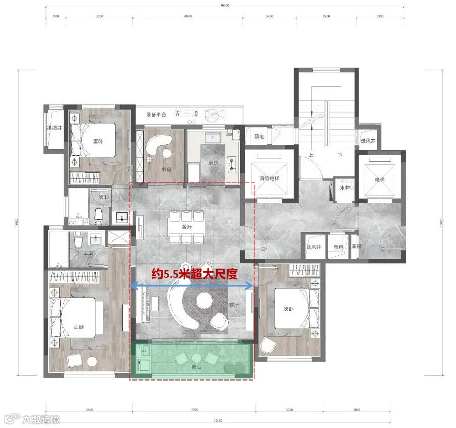 方厅建筑面积约40㎡,约5.7米的宽厅,通过LDKB贯穿式的公厅布局,让阳台、客厅、餐厅与厨房彼此链接,从而形成大洄游空间的品质越级。