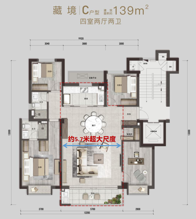 万科约139平方米4房2厅2卫,2梯2户,独立入户;5面宽朝南、南向2面宽阳台,客厅+餐厅+阳台一体化南北通透竖厅,阳台尺度高达约7.1米,主卧套间+独立步入式L型衣帽间+主卫3件套+南向大面宽飘窗。