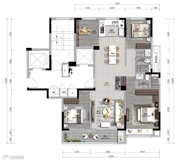 经典四叶草布局,每个房间互不打扰,空间上更加私密。奢适的主卧空间带来酒店式的阔尺感,而且玄关收纳、餐厅收纳、卫浴收纳,一切游刃有余。