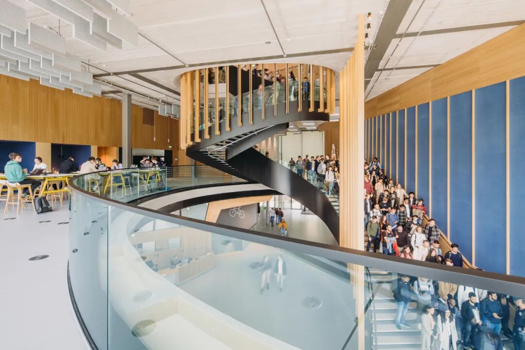 The interior offers a warm welcome to visitors. At specific positions, bamboo ribs extend along the ceiling, forming an integral part of the design. The crafted look and feel of the bamboo are extended around the central staircase, that in one gesture joins the study and cooperation spaces into one connected world of learning, collaboration, and connection. This centrally positioned 'grand stair' facilitates and promotes physical movement through the building and thus contributes to the health of students, researchers, and teachers alike.