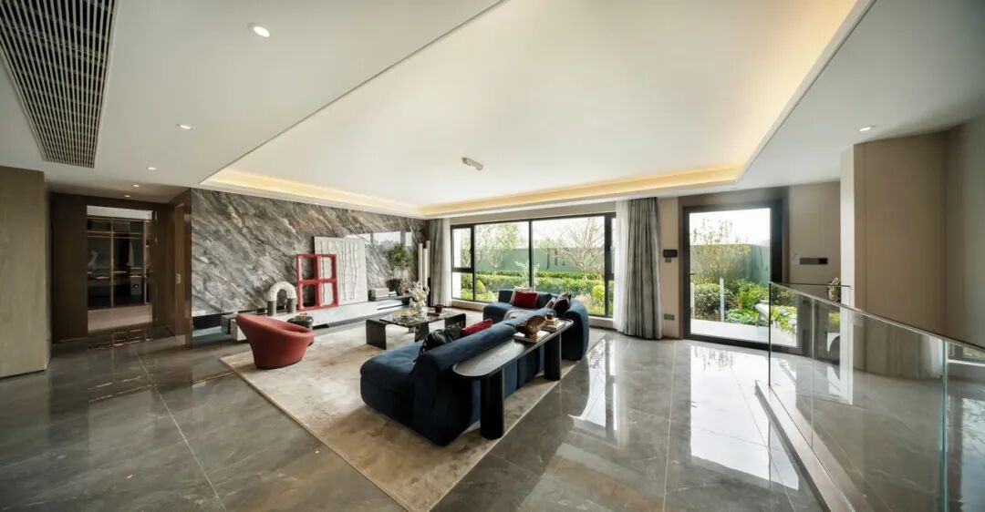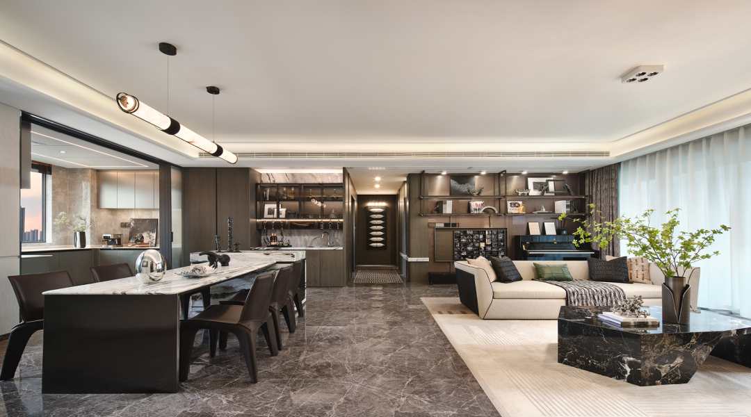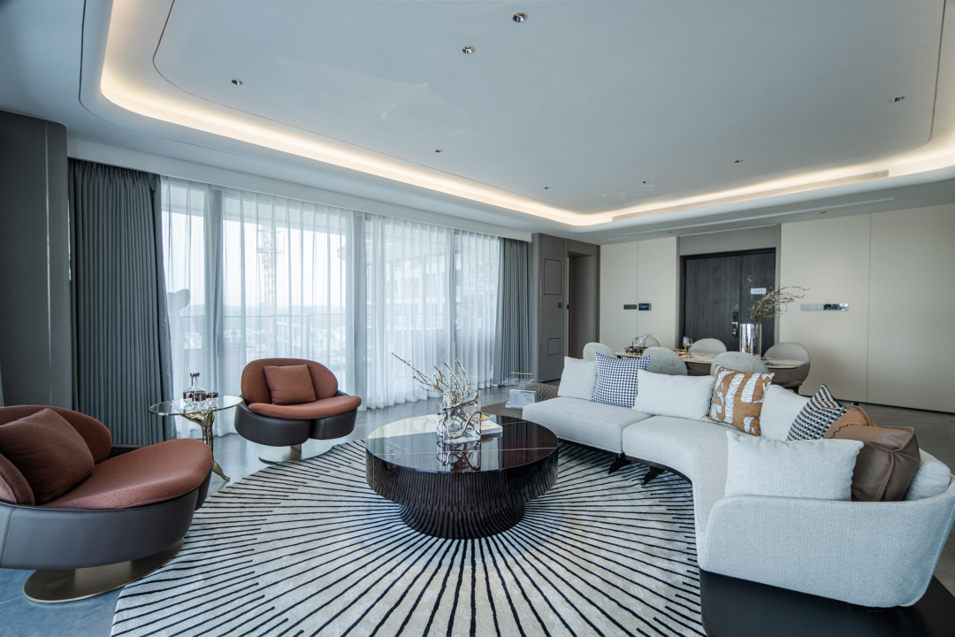 客厅约3.3米阔尺层高,登阶揽藏非凡情境。生活理念高度与建筑设计审美碰撞,以突破传统层高设计,兼得大面宽与奢阔层高,迎纳清风阳光,匹配生活品位与气度胸襟。
