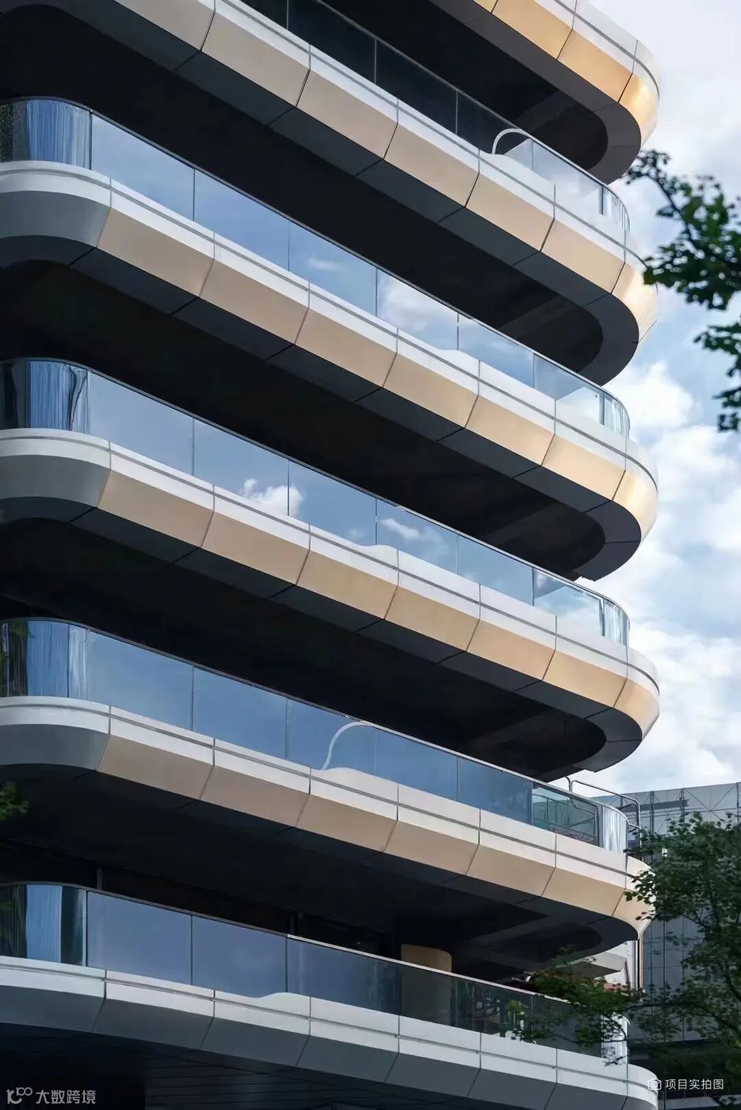 大面积LOW-E蓝灰玻璃、隐框玻璃栏板运用灰色和米白色外立面搭配香槟金极简线条,打造品质美学建筑群。