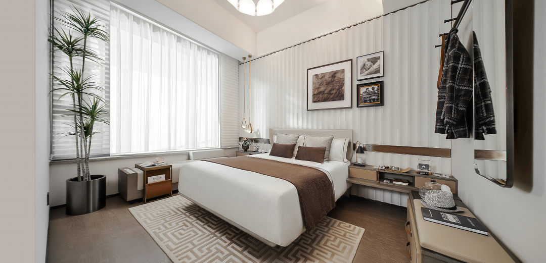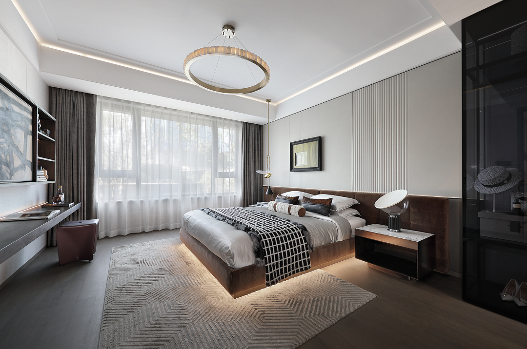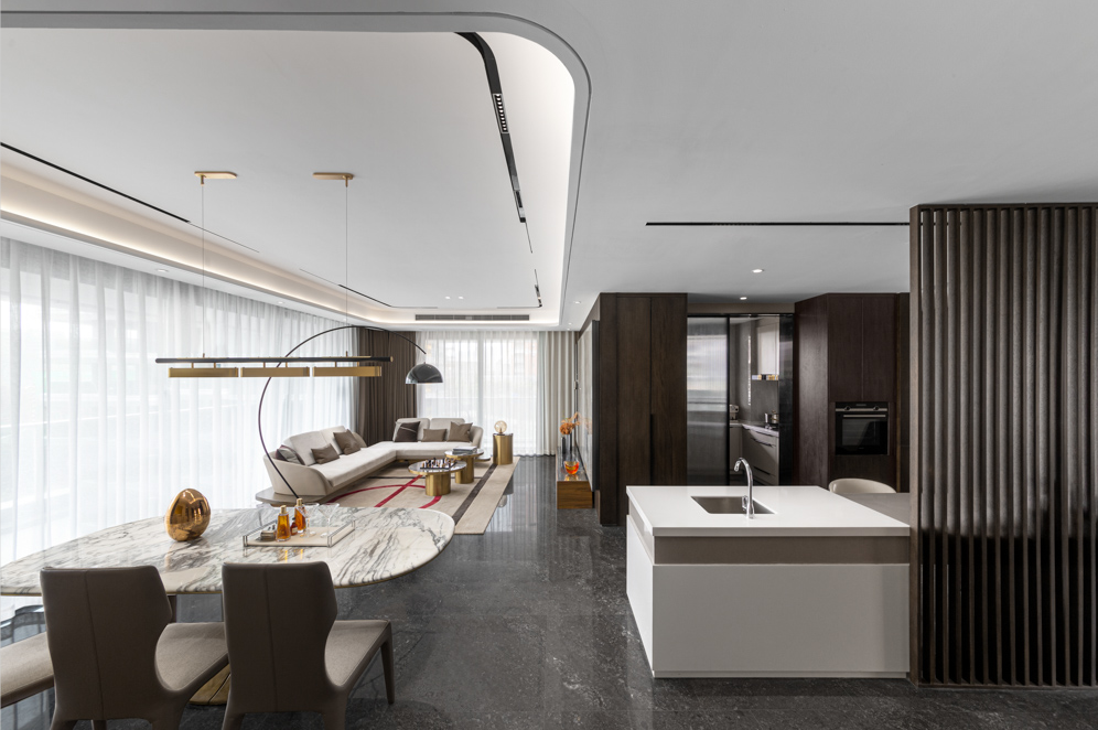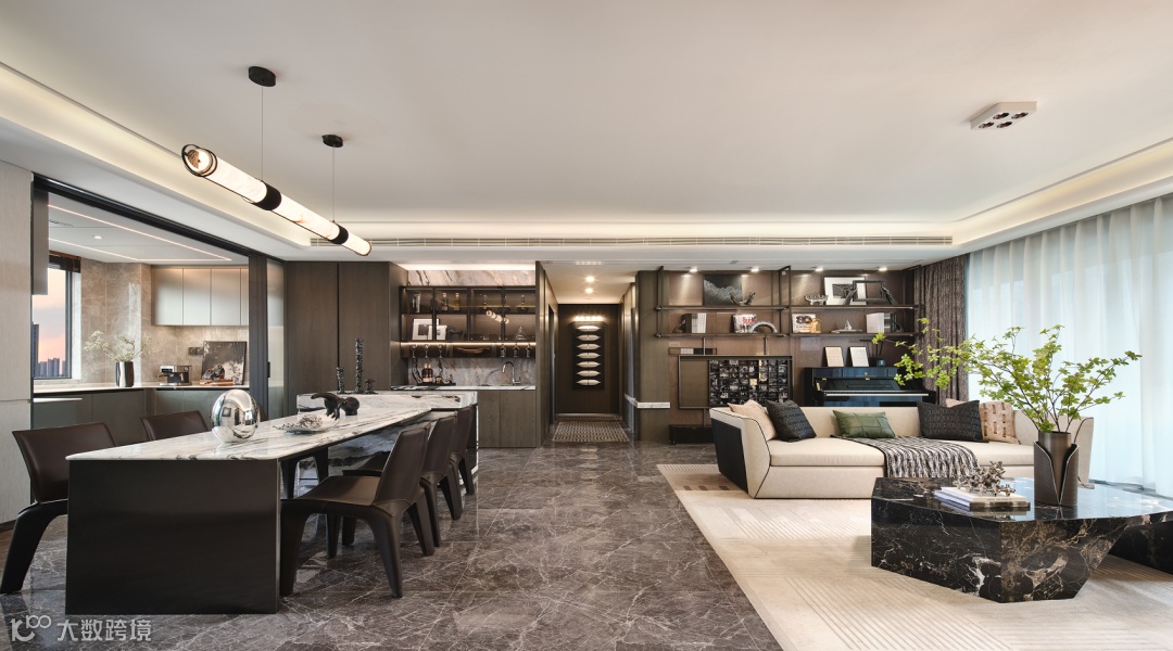 以东方美学现代化表达手法演绎室内装修风格,所有空间没有狭长过道多余浪费空间,客餐厅与超宽敞景观阳台连在一起扩大视线范围及人的活动空间,形成开敞、亲切的互动交流氛围,创造全家庭无界互动、交流空间,营造更旷达、从容、丰盈的生活哲学。
