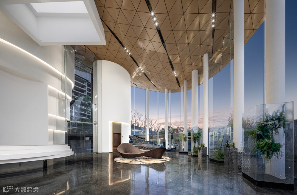 在建筑外立面上,招商·新川臻境采用香槟金线条造型作为视觉符号,搭配大面积通铺的LOW-E蓝灰玻璃。在不同的天气下,甚至会有差异化的视觉感受。