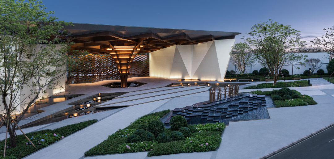 U型的空间围合下,多层级的动态水景与定制化弧形金属格栅形成进入社区后的视线焦点。照壁金属格栅做法上采用双层格栅,通过前后规格不同进行图案叠加,视觉上达到立体效果