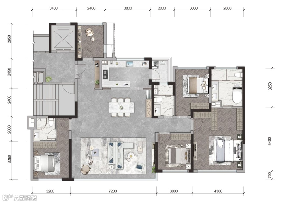 项目产品上来说,338-362㎡的面积区间,尺度上几乎超越了99%的大平层,前后双花园、地下车库入户的设计,又能将墅级体验拉满。