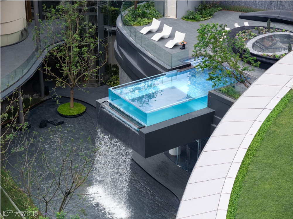 成都是平原城市,但项目别处心裁的使用高差打造出立体景观,也使得建筑轮廓以自然流畅的弧度为景观奠定了完美的曲线基底;以“一条峡谷、六座浮岛”为设计理念,楼栋之间错动交互,整体呈现三维立体生态系统。