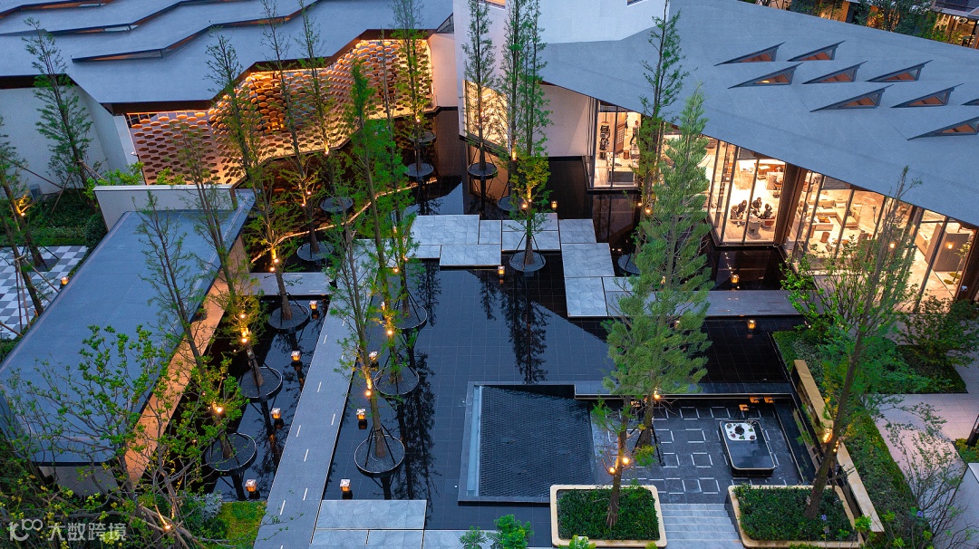 项目主入口位于基地东侧,以仪式水院—入口门廊—林荫水境—归家大堂—自然花园的线性归家巷道空间为动线,融合光、风、水等自然元素,构建三轴、二环、十二院的景观体系,营造出场景化的社区空间。构建闹市中的隐逸之所,公园里的幽闲之境。