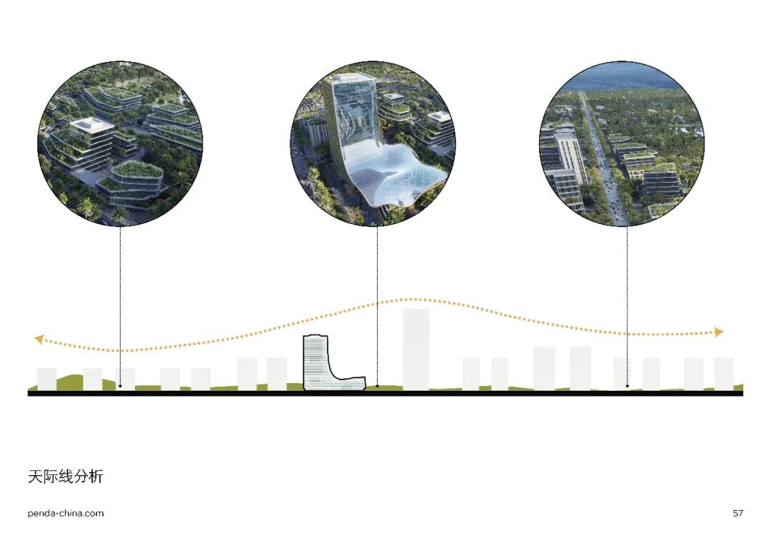 Penda China的设计灵感来源于“海浪”和“晚礼服”,海浪是海口海洋城市的最大特色,建筑呼应了城市文脉和自然环境特色。让建筑与环境互相对话交流,融为一体。同时本项目作为江东新区核心区,未来各种盛典活动必将轮番上演,所以“晚礼服”的优雅与华丽似乎也在勾勒着那令人向往的都市繁华景象。