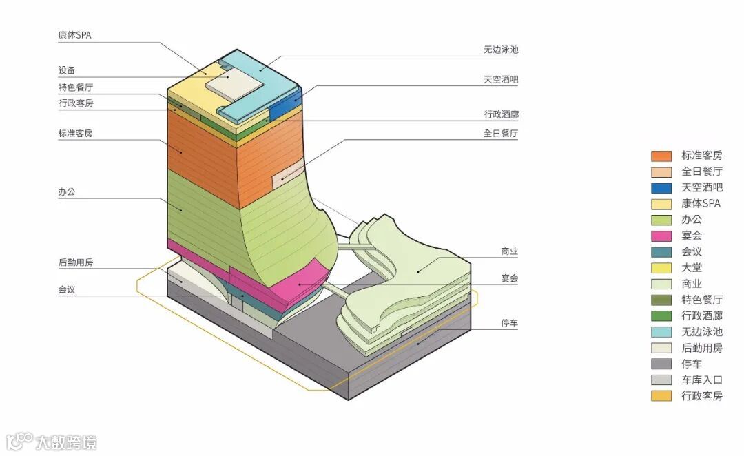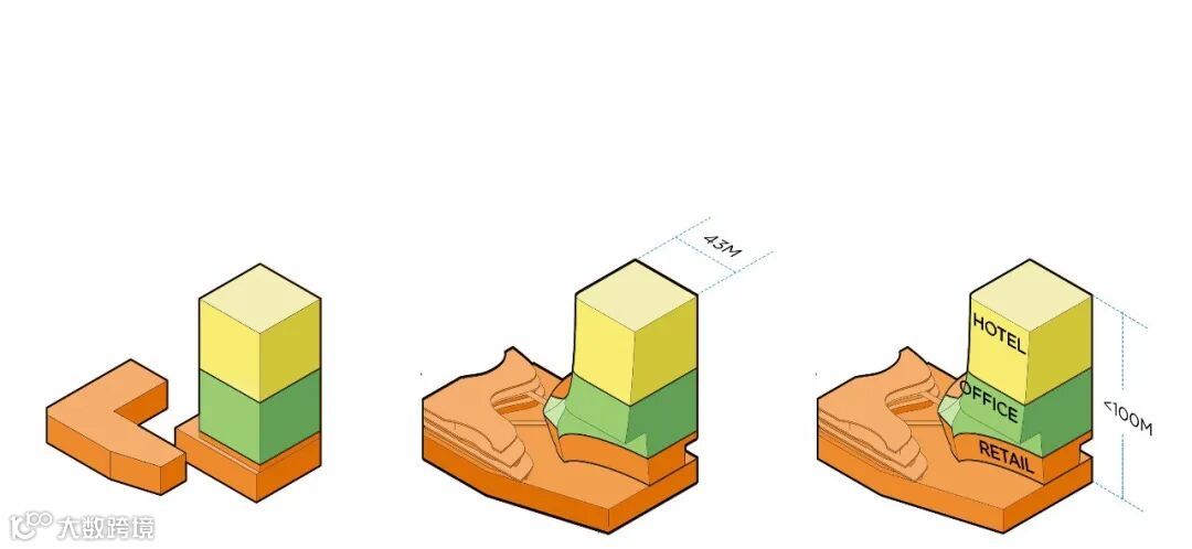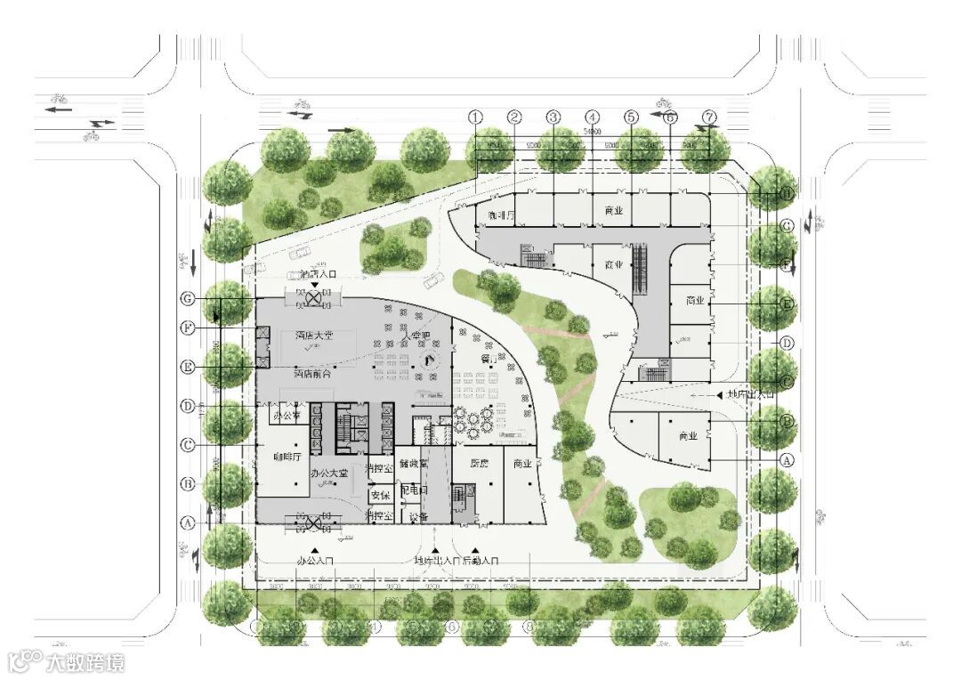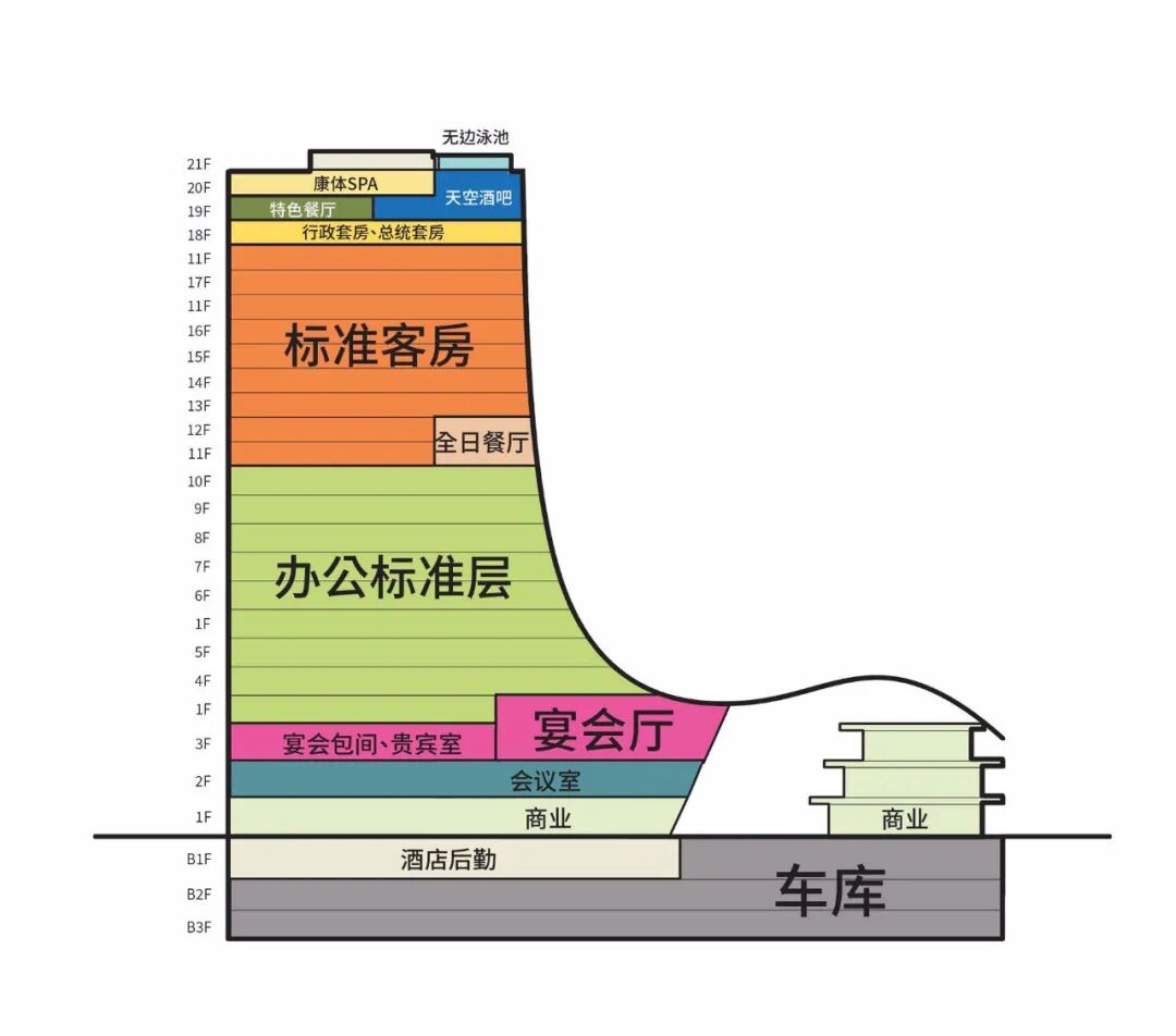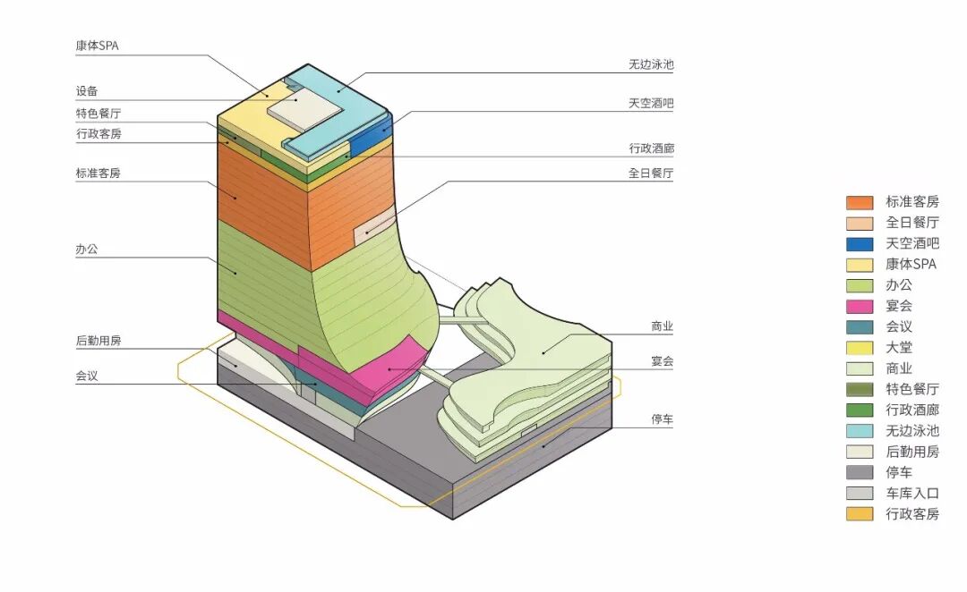 建筑底层起伏的遮阳/遮雨屋顶为底部商业创造全天候的购物环境。开放式的街区商业既服务于酒店又为城市居民提供了舒适独特的休闲购物场所。