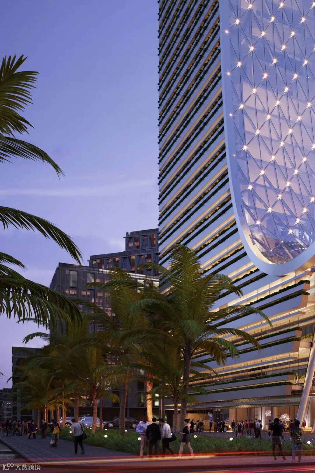 夜幕降临华灯初上,建筑立面上的钻石结构的灯光闪耀时,本建筑将成为都市中心的标志之一,从海面远望,它也会在高耸的楼群中夺目而出成为江东新区的新地标。