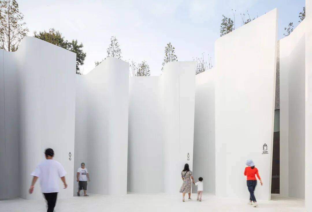 阿朵小镇公共卫生间白色复合铝板明媚洁净,拥有显著的辨识性。