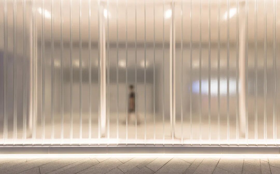 门厅外立面材料以超白U型半透玻璃与白色珐琅钢板相结合,材料及环境的虚实交融关系更是如同美术馆对艺术审美和文化传播的融合。