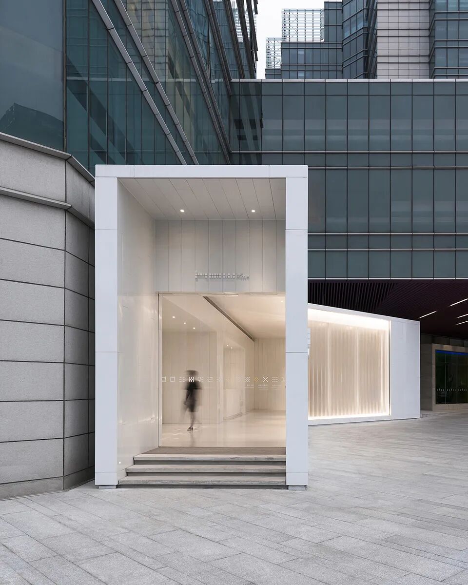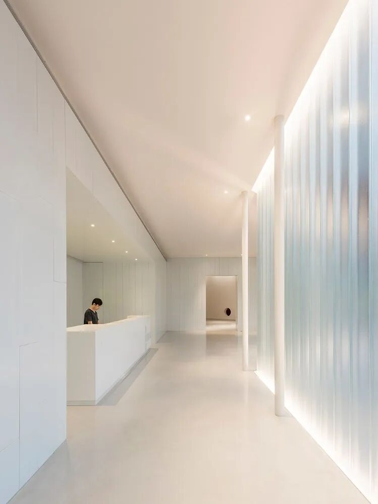从外形到内涵,设计语言简约,进入门厅后的室内空间亦如此,室内立面延用了室外的白色珐琅钢板、地面为硬化水泥,灯光的设计利落干净,充分保持着艺术展示空间的纯净性。