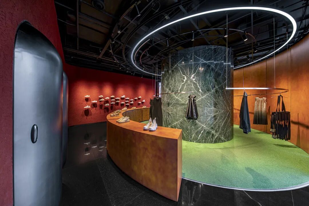 北京KIKS的核心展示区、衣架、鞋柜、隔墙板等主要功能构建在主题空间依次排开,可升降、可绕轨道运行、可拆卸。