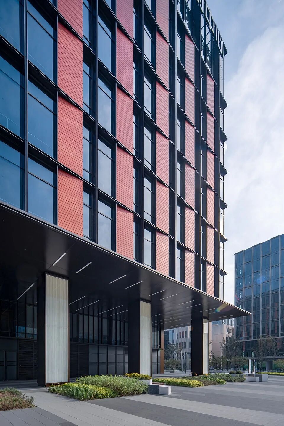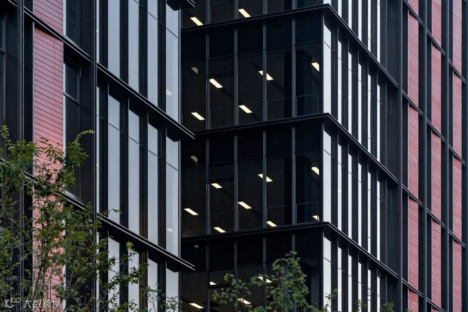 主楼的基座部分采用了黑色的石材和玻璃,从而增加了底部的稳重感;中部立面以红色陶板和玻璃幕墙为主要材质,呈现出竖向斜面陶板与玻璃幕墙虚实相间的立面效果,并在光影下显示强烈的韵律感,塑造出对比强烈且极具秩序感的标准段落。