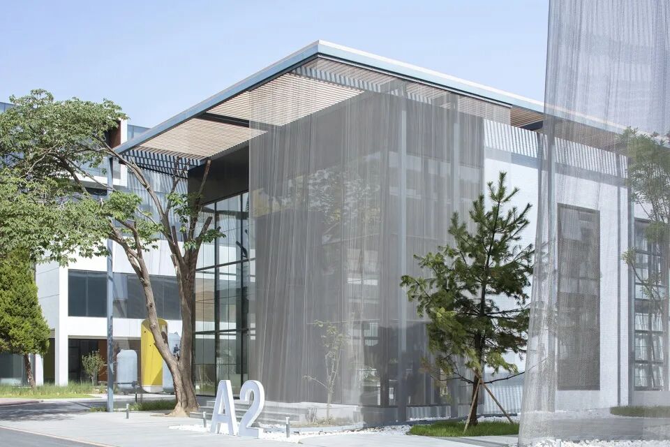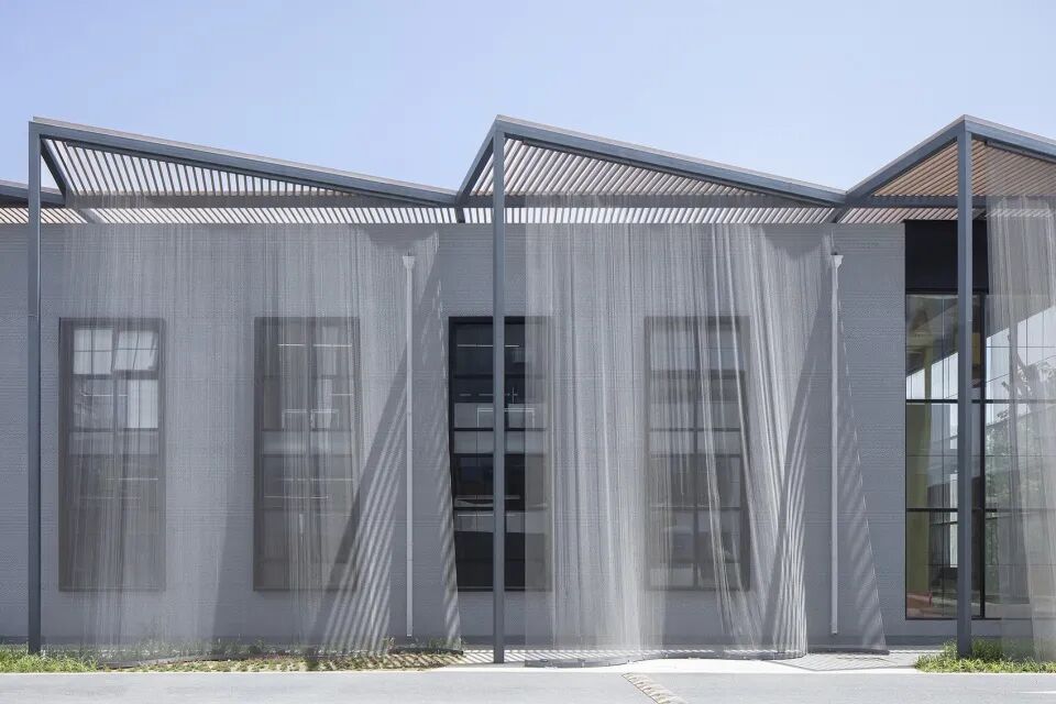 北京Fashion Factory创意工厂改造后的建筑外立面使用了钢制纺织品材料,像是在大楼周围轻轻披上遮阳和隐私的金属幕。