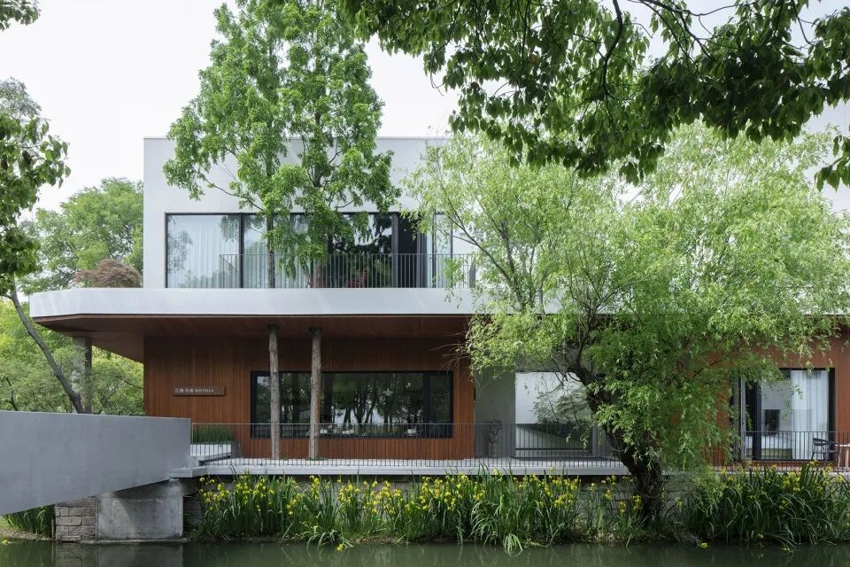 昆山江南半舍民宿在一层外立面上采用了竹钢作为主要材质。竹钢作为自然材料不仅从质感上让建筑与环境更加融合,触感上也更加柔和有温度,给人一种放松且温暖的感受。