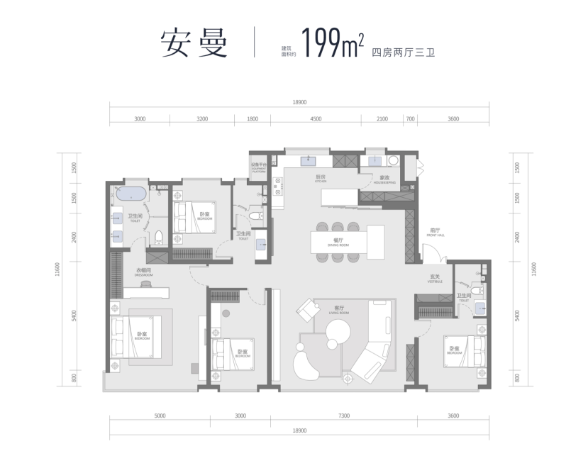 建筑面积约199㎡ 四室两厅三卫大面宽,全景落地窗,着实不错,IMAX全面屏宽幅采光。