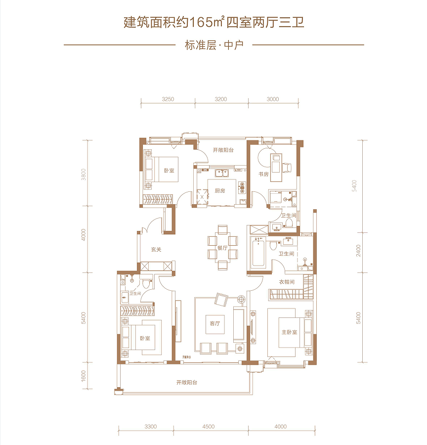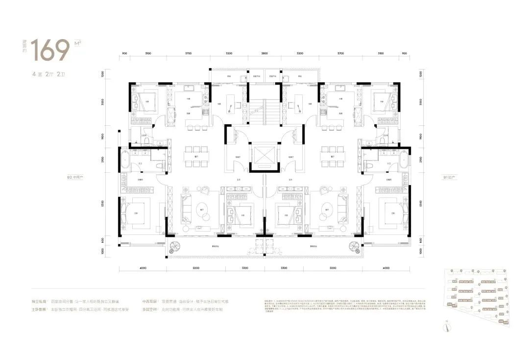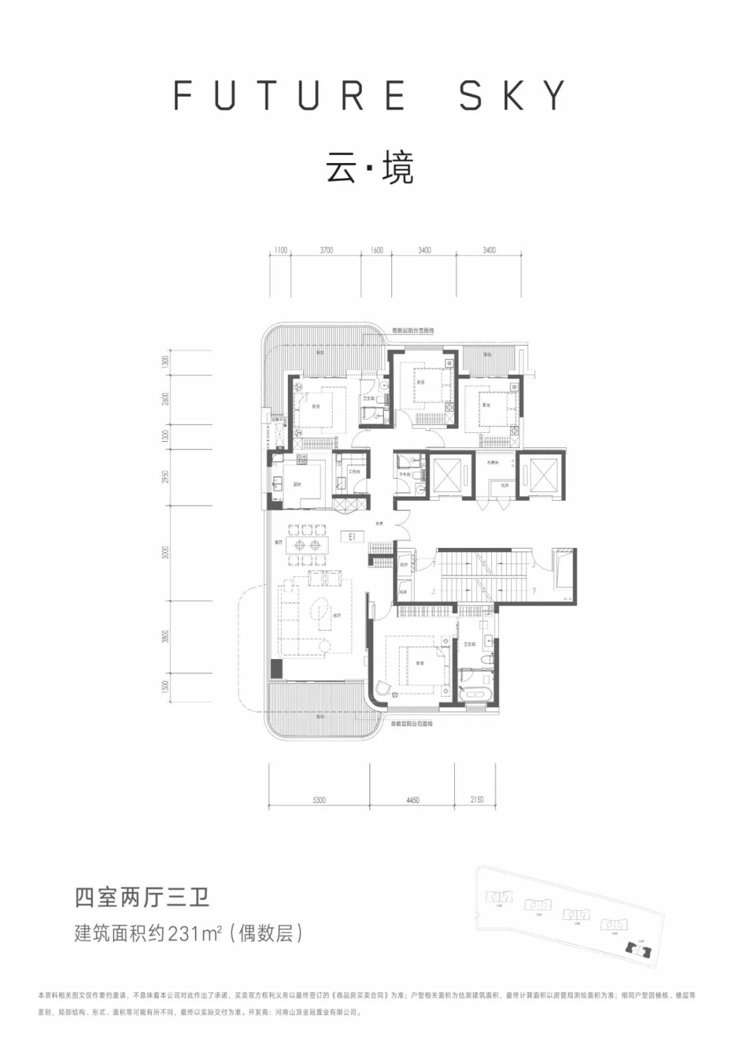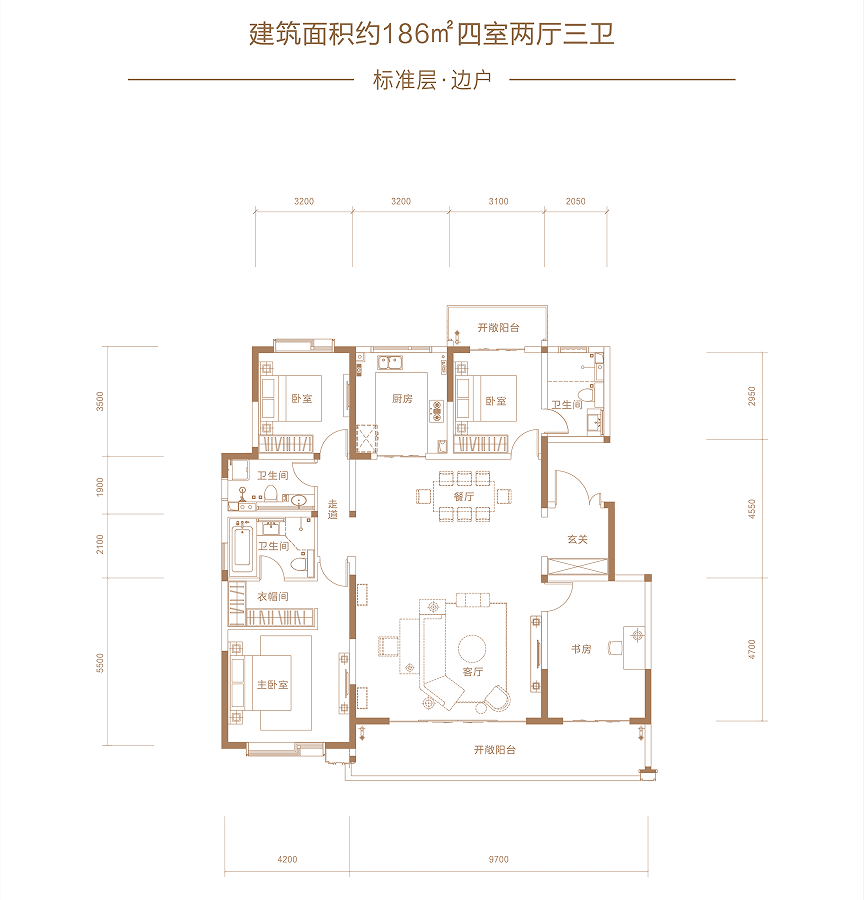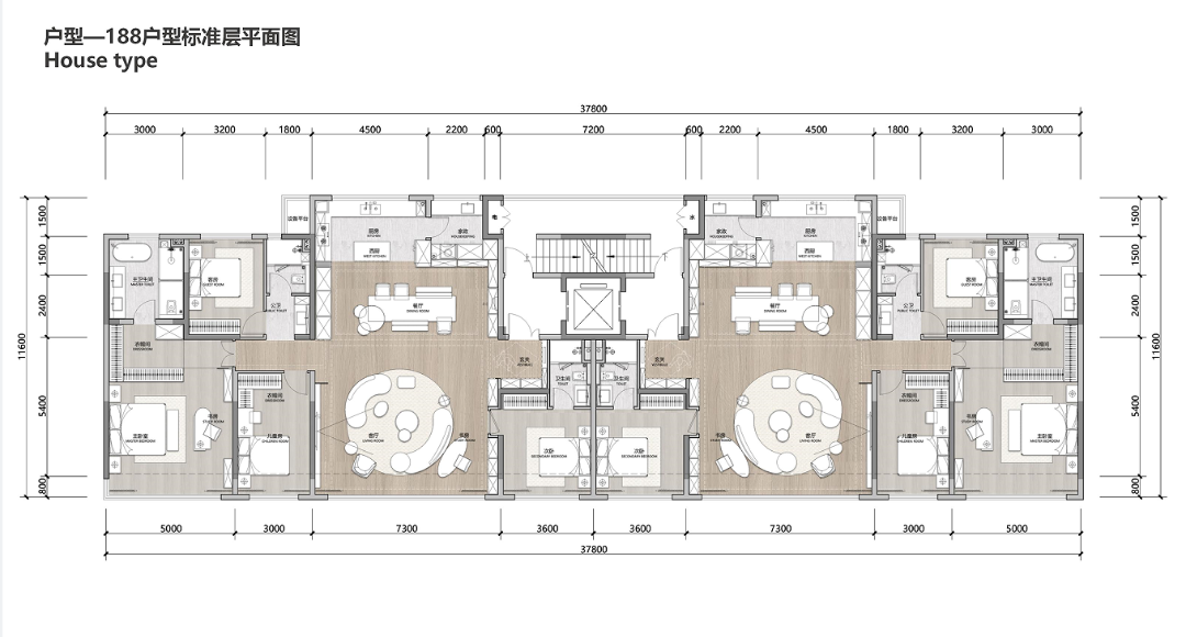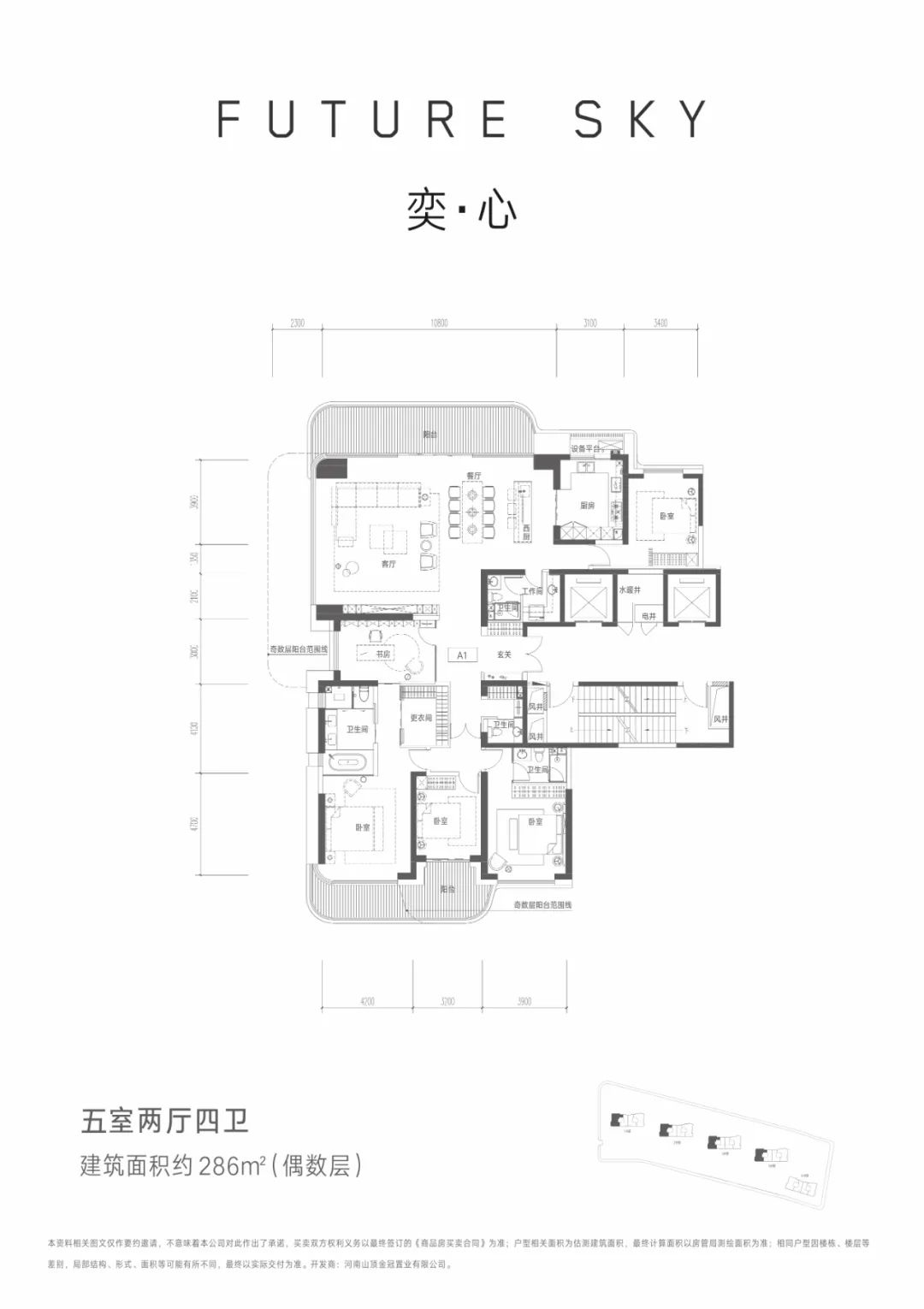 建面约220㎡四室两厅两卫户型,约59㎡LDKG大通厅,约46㎡套房式主卧,约11.7m南向大阳台。