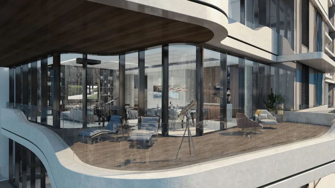 阳台采用上下错层设计,6.3m挑高不仅保证了足够的视野,更在立面上营造出层层叠叠,悬浮向上的形态,圆润的曲线使建筑整体造型富于变化,而又飘逸灵动。