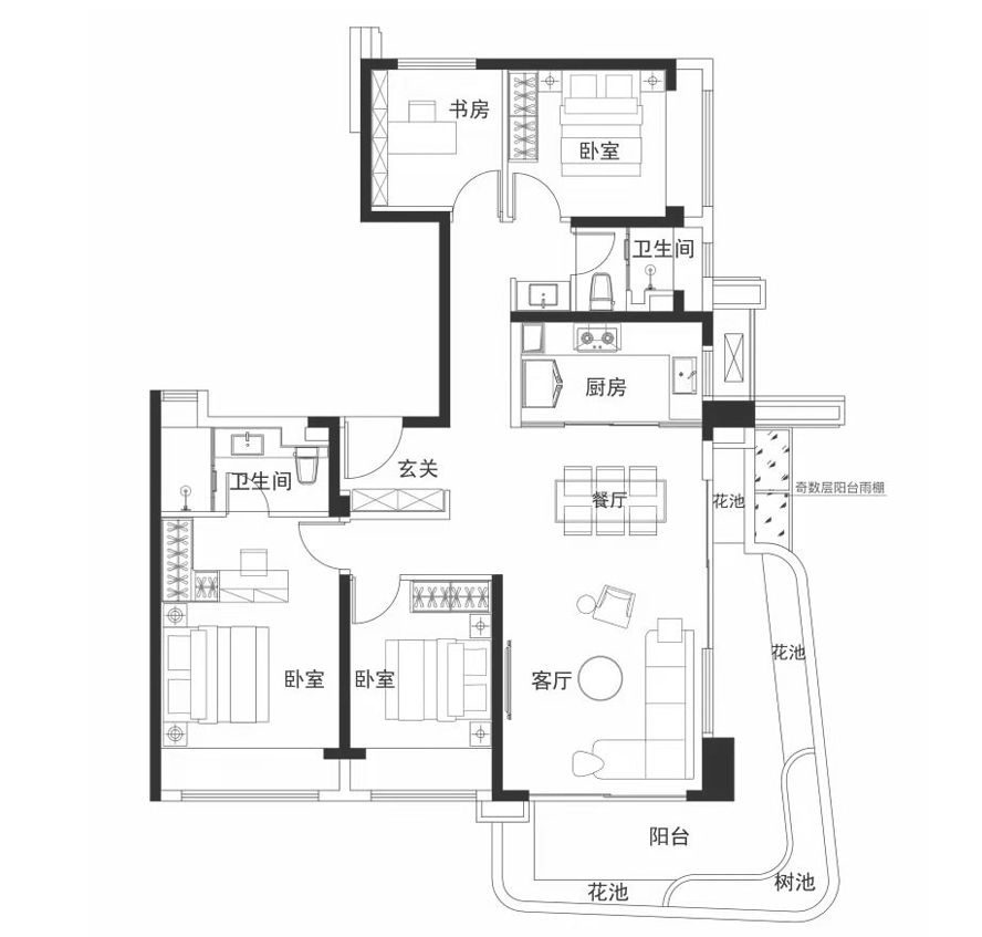 项目设计创意巧妙地在各个错层空间设置了不同尺度花池和树池,花池、树池的深度可满足小灌木种植需求,借助绿植的天然屏障,有效解决花园阳台相互错动带来的上下层侧向对视问题。此外,飘窗的设计,也可以一定程度避免上下层视线干扰问题。