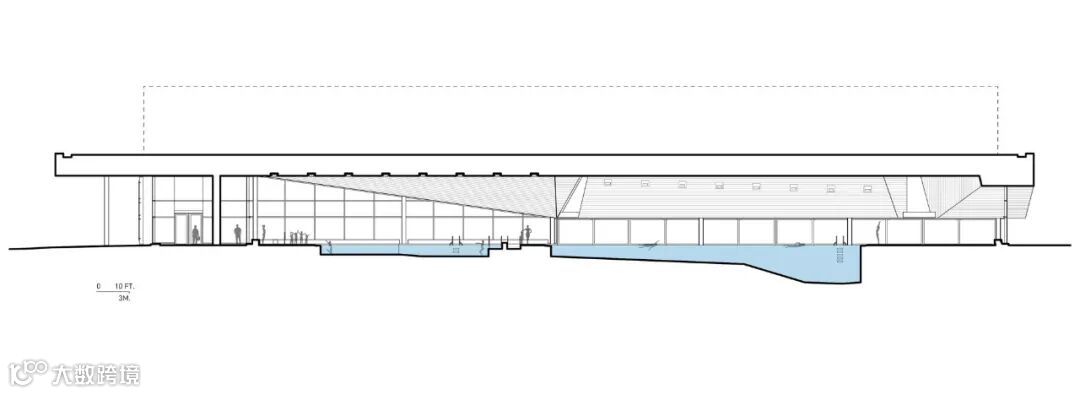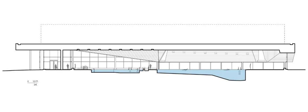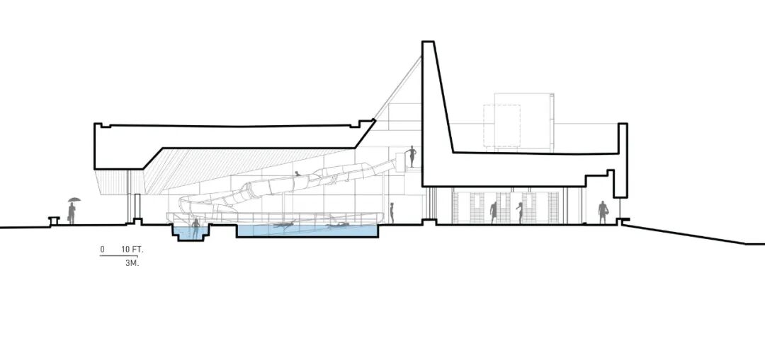 该设施还在主泳池大厅外设置了两扇双滑动玻璃门,供人们在公园边的露台上进行日光浴。为了回应公园周围新的高层塔楼的景观,该建筑的绿色屋顶被设计成第五个立面,与建筑特征和公园环境融为一体。