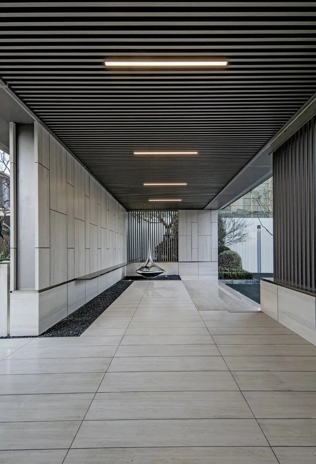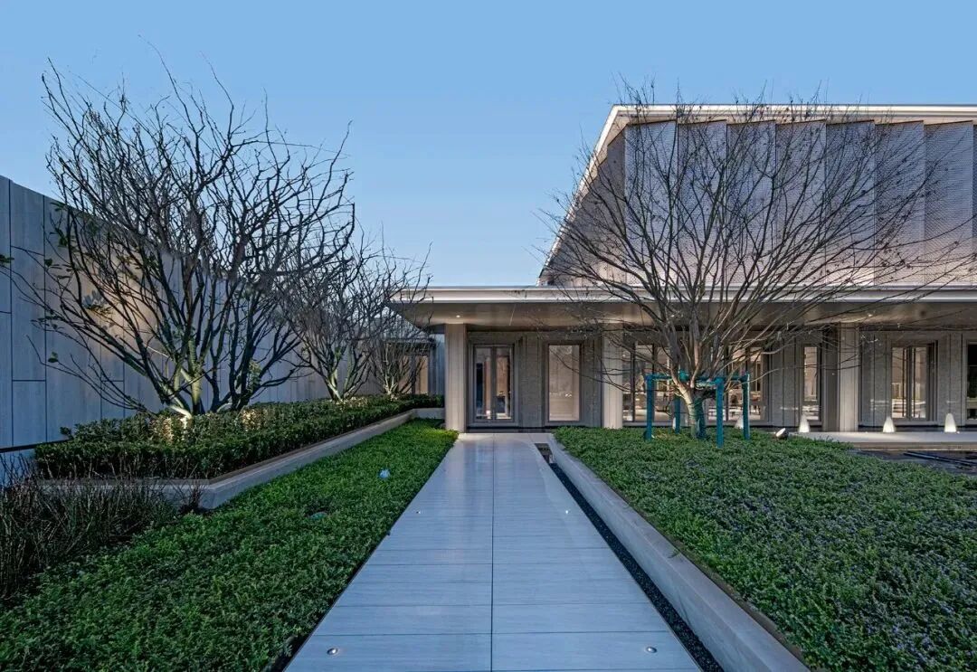 转入后庭,自然光影随格栅排列灵动流转,纯粹的视觉空间因光的注入,增添温暖与力量,赋予柔和而静谧的感知。随景墙转换抵达浪漫情境,回归生活的悠然闲适。