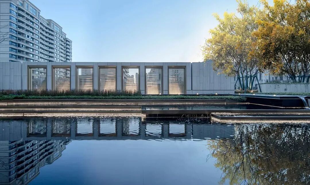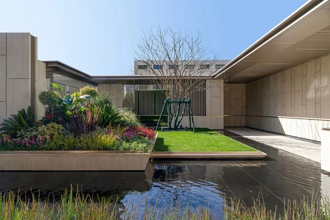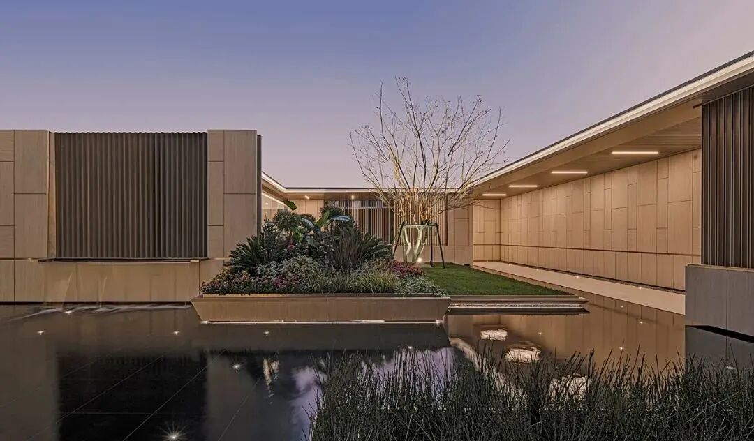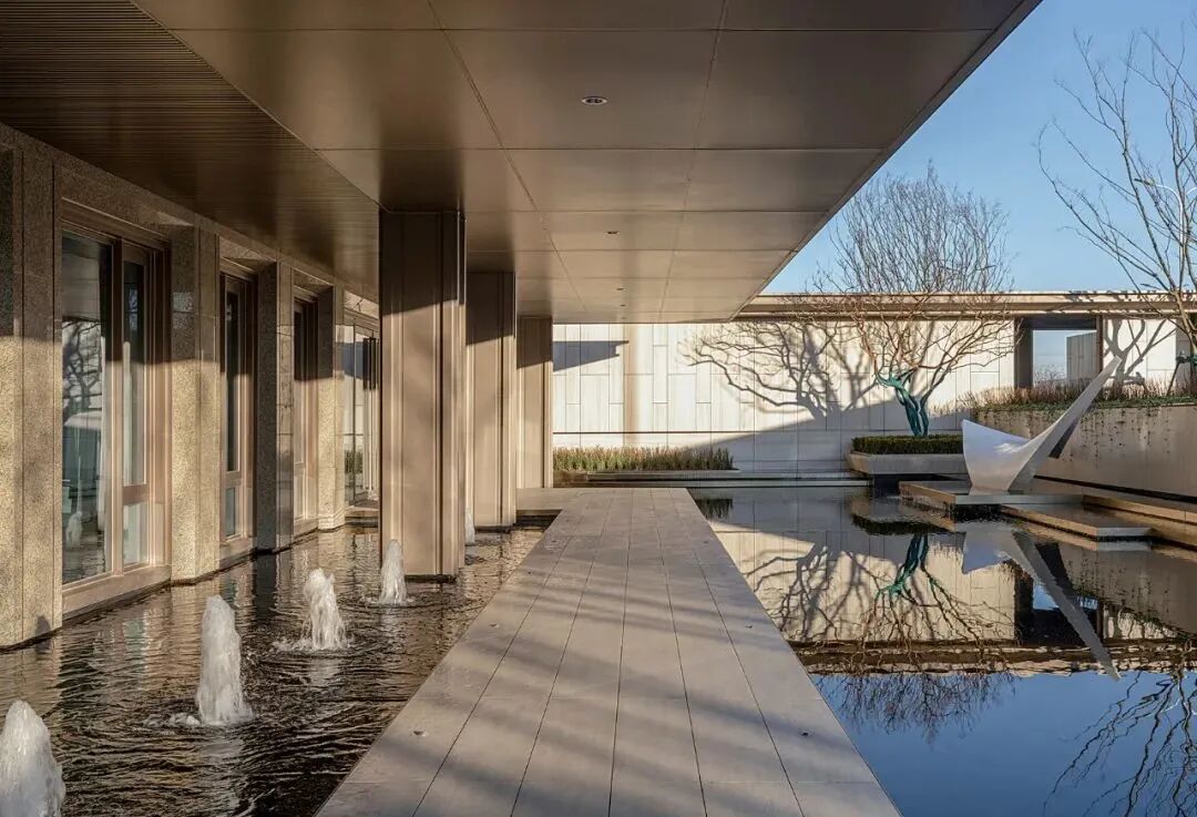 空间演绎着丰富的视觉层次,景墙、植物、水与建筑以相互界定而融合的关系,构成丰富韵律与节奏,以小中见大般,引发百川归海的氛围。