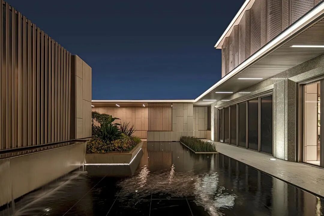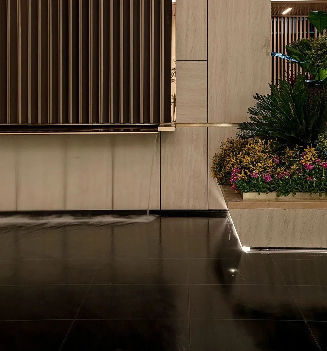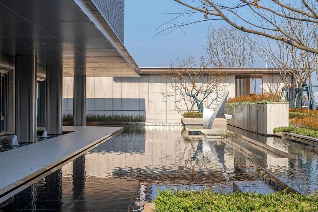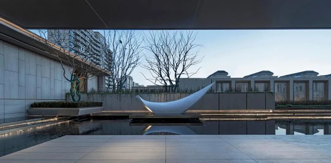 空间演绎着丰富的视觉层次,景墙、植物、水与建筑以相互界定而融合的关系,构成丰富韵律与节奏,以小中见大般,引发百川归海的氛围。