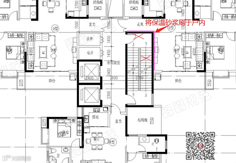 在采暖区,楼梯间有时需刷保温砂浆,此时需注意,需将保温砂浆刷到户内(一般刷保温砂浆饰面层达20-30mm厚)或加宽楼梯开间。