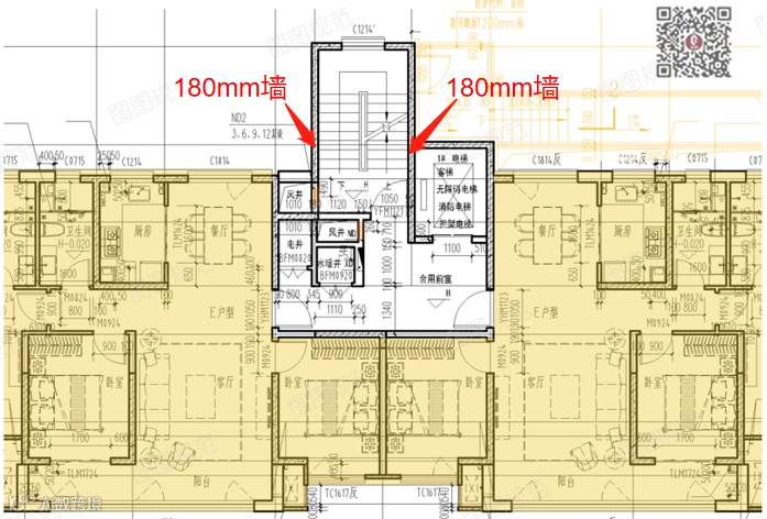 对于通过式楼梯,一般为11~18层住宅,通过计算,低抗震的一般地区两侧墙体为180mm墙厚完全可行。在此,探讨通过式楼梯,前提是两侧墙体为180mm墙厚。