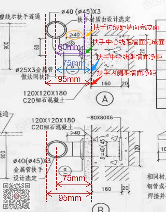 如果按新算法(扶手内侧来定的话),扶手内侧距墙面净距需≥95mm(普通饰面层厚度:15mm)。