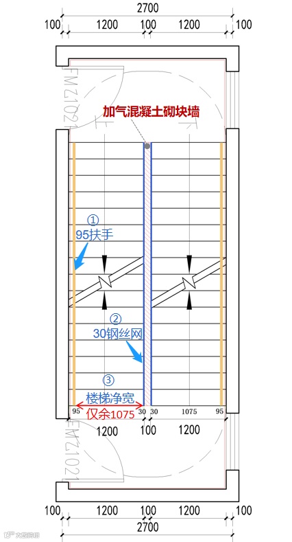 剩余净尺寸仅为1075mm,不满足疏散净宽1100mm的要求,因此正常做法下,2700mm楼梯间无法实现。