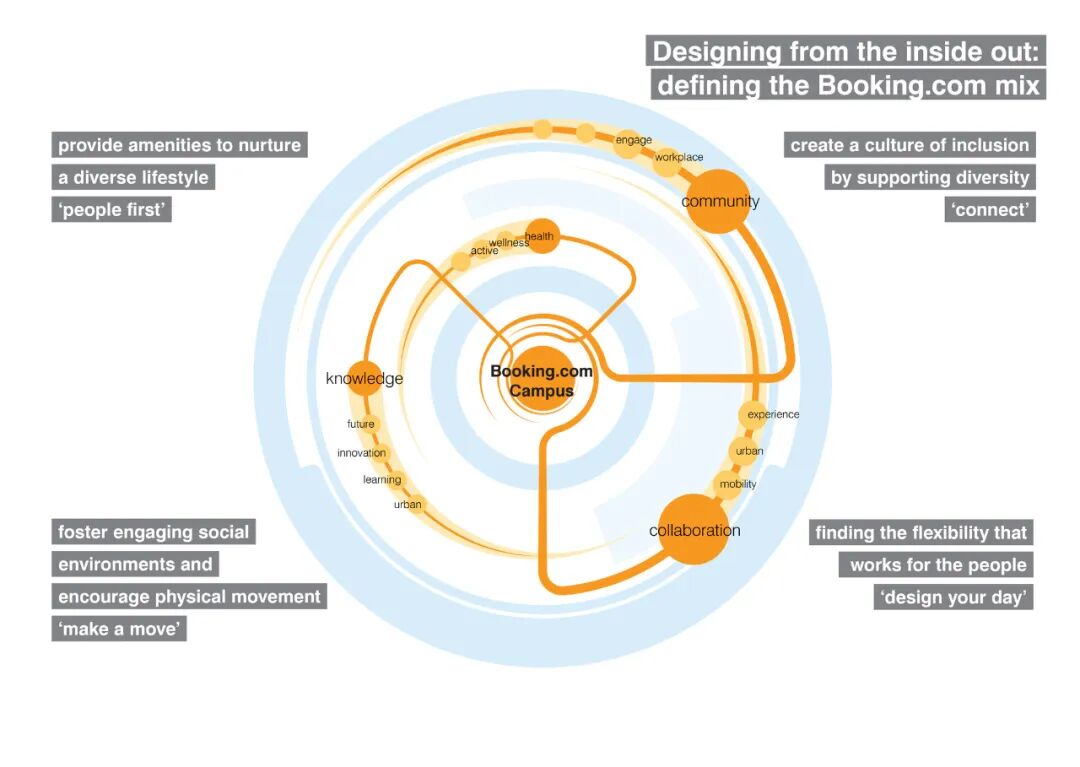 The architecture of the Booking.com City Campus. In 2015, Booking.com, together with BPD (Bouwfonds Property Development), selected UNStudio to design their new campus in the center of Amsterdam. From the outset, the goal for the buildings was to create a healthy community; to bring employees together and to attract new talent from across the globe.