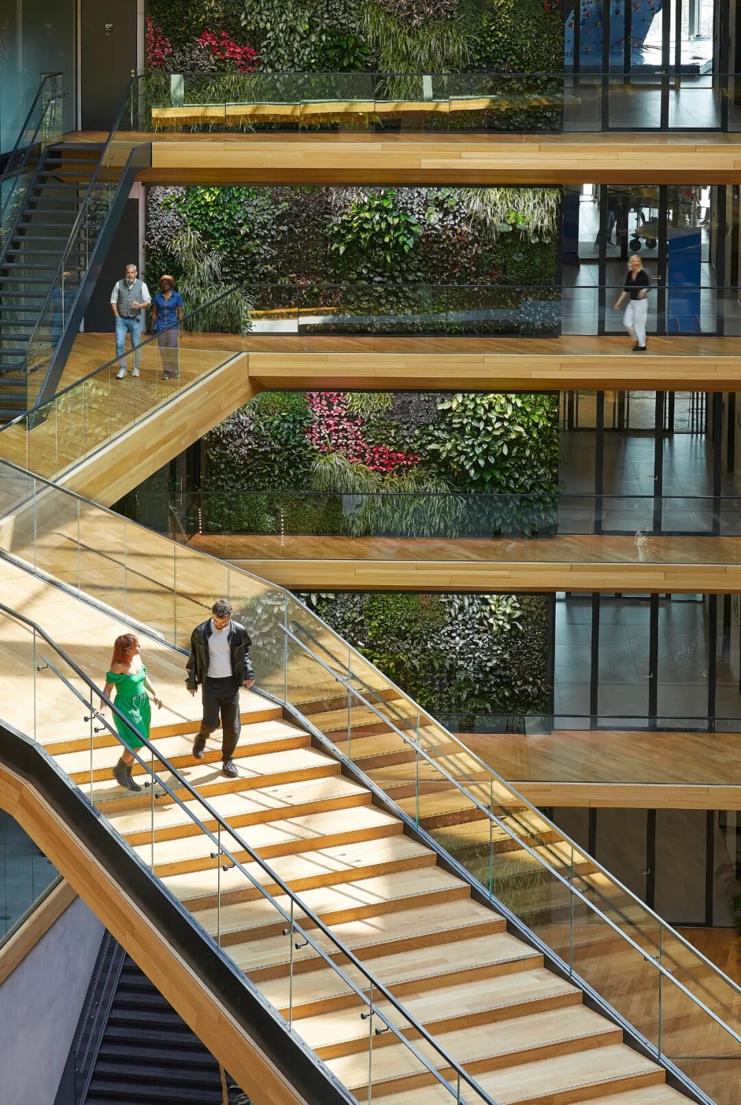 Throughout the building, the architecture nudges employees to move by fostering engaging environments and by encouraging physical movement by use of stairs, bridges, and galleries across all levels, including the rooftop. Even the emergency staircases become part of this concept, as untypically these are glazed along the atrium side, which not only encourages daily use but also offers light views from the stairs and visibility from the other spaces in the building.