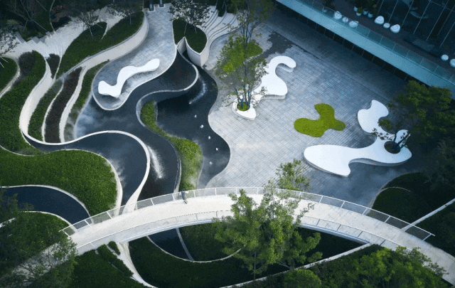 下沉庭院:通过人工方式处理高层和造景,将原本地下空间变成可以拥抱阳光的开放式空间,形成双首层的景观体验。