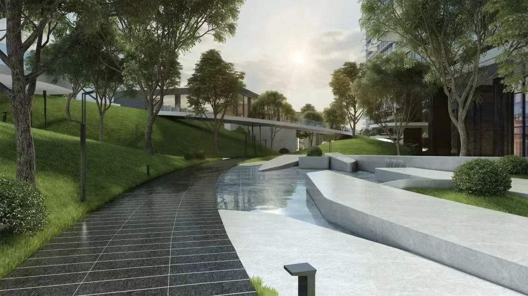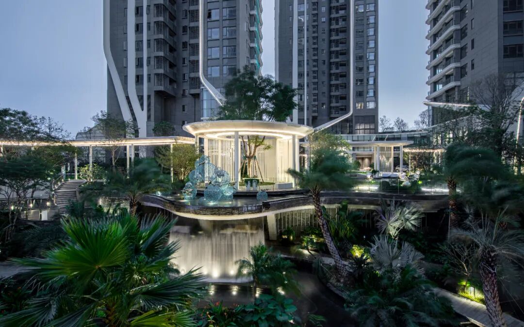 成都华发统建·锦江首府项目的景观设计理念取自四川盆地概念,设计有碧水瀑布、下沉空间、空中连桥、台地景观等多处景观节点。