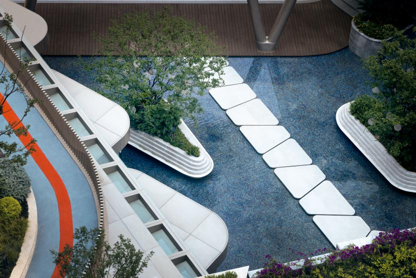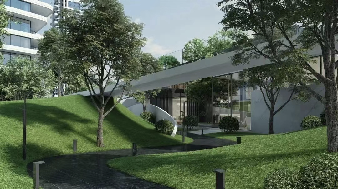 在三重立体景观的设计上,根据不同的地形和坡度以退台的手法打造层层叠叠的景观,通过上下高差、内外借景、虚实变化的手法营造俯景与仰景、虚景与实景以及内景与外景的呼应,展现无限可能的复合式立体景观空间。