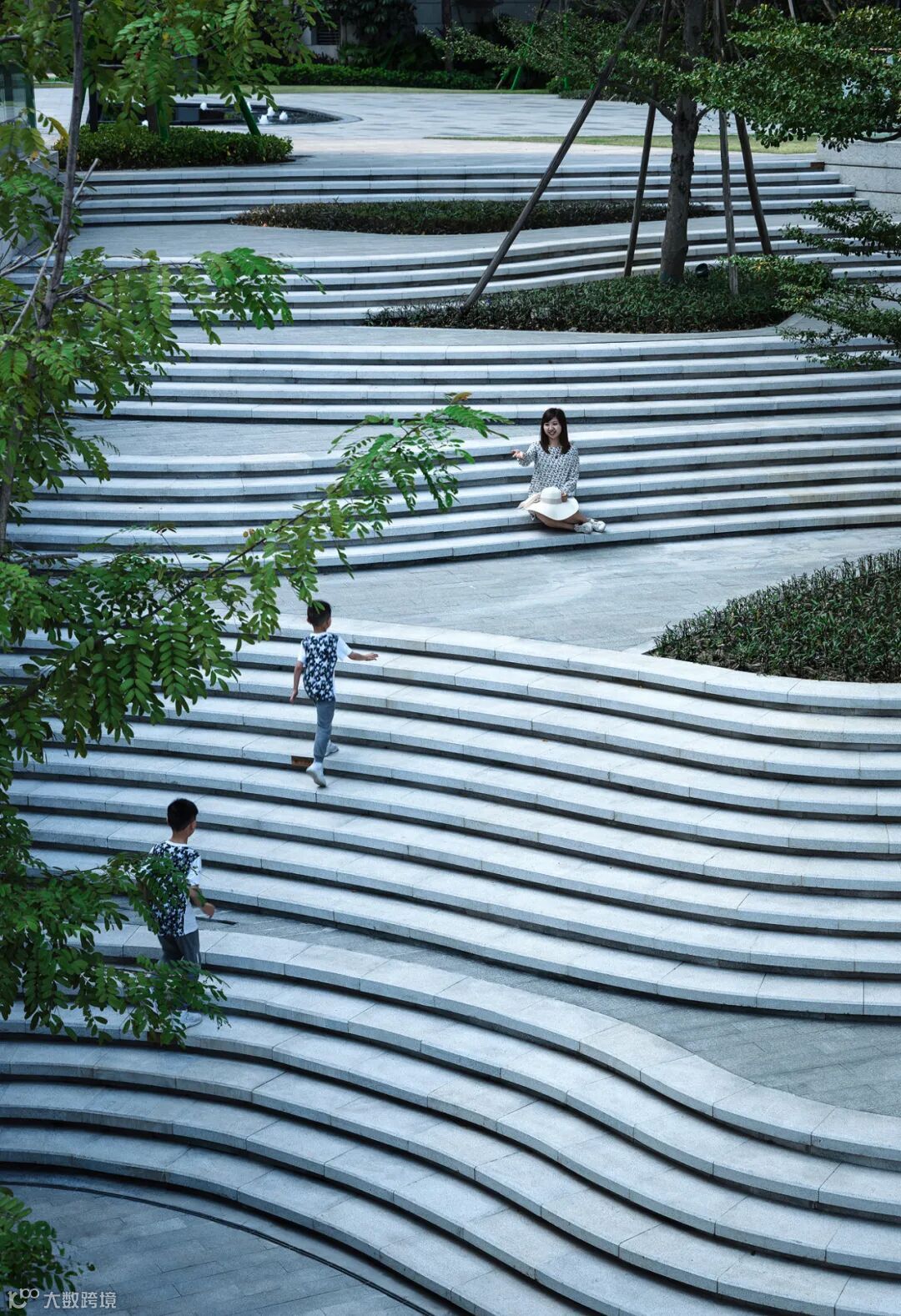 长沙绿城凤栖鹭鸣下沉花园与园区有4m高差,室内通过电梯连接,室外通过台阶连接,实现双向生活体验。