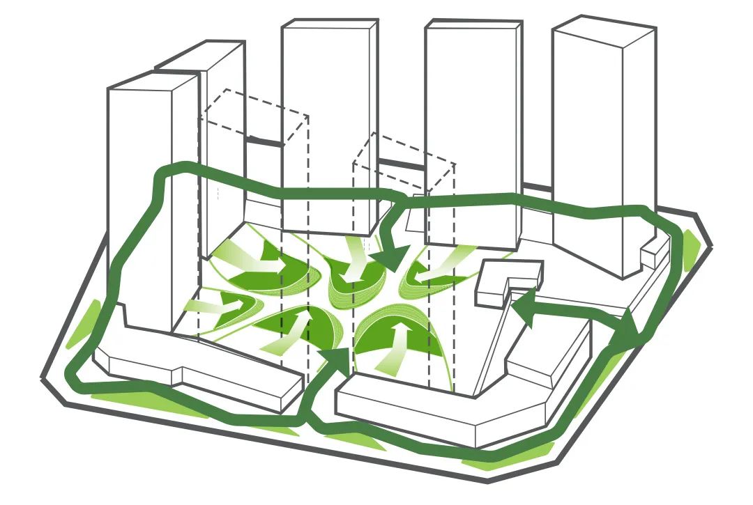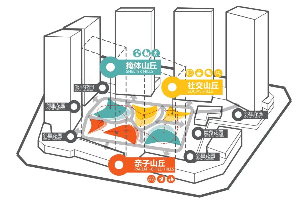 在社区中庭内创造了一系列向庭院中心聚拢的“峡谷”,活动节点被巧妙地结合在峡谷之中,流线型的步道随着地形变化形成联通的立体动线,引人深入峡谷,去体验各类户外活动和自然空间,并带来各具特色的空间氛围。