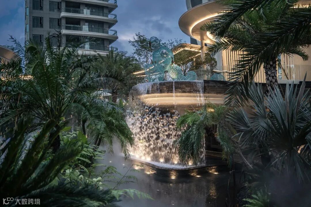 瀑布从空中奔流而下,汇于郁郁葱葱的热带雨林下沉庭院,形成的溪流,穿梭于热带风情的绿化之中。