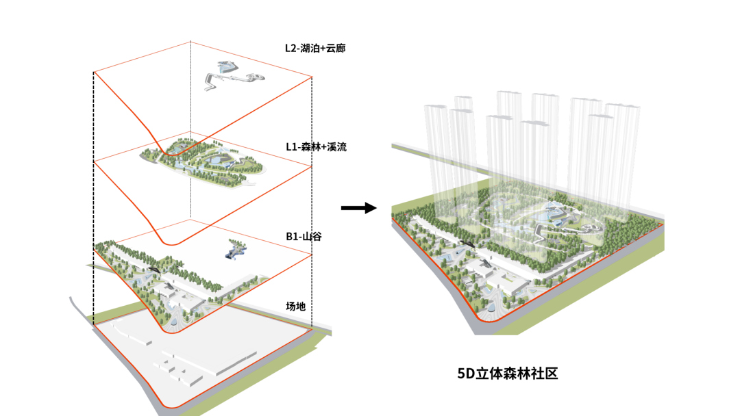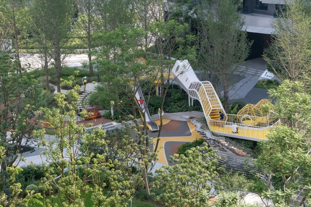 项目把山体之林,引入园内,与山无界,从而营造了“藏于山、长于林”的山地景观;同时将高差融入各类空间,打造各具特色的景观空间。