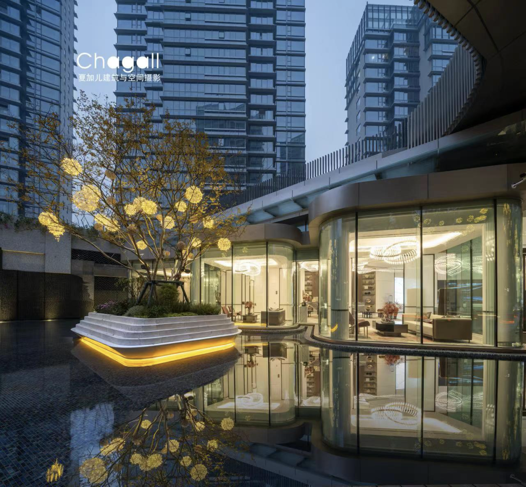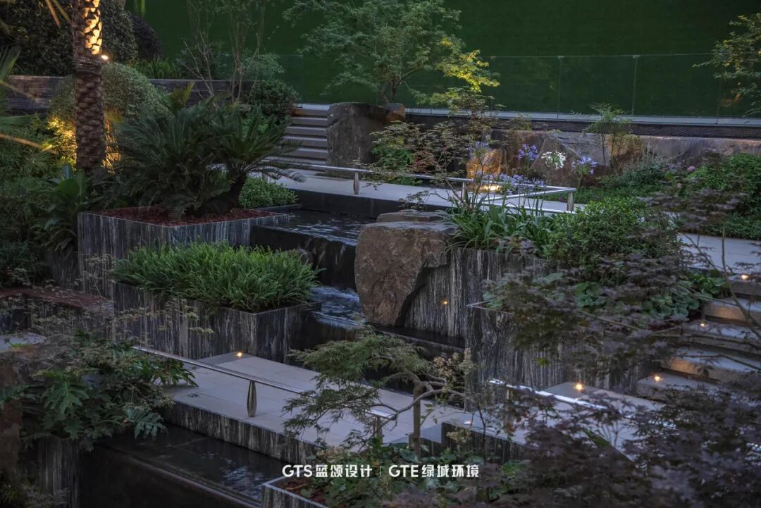 比如成都万华·麓湖-汀院,场地的建筑围合形成了较为封闭且有较大高差的景观空间。