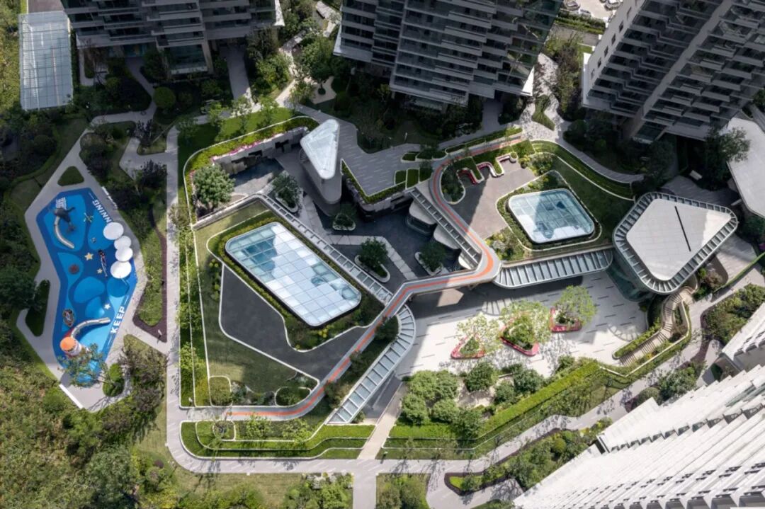 郑州龙湖未来天奕将在社区打造山谷立体式坡地景观,高差约5米,社区景观内设置有电梯。并且设置了很多浮桥,在增加景观互动的同时极大的增加了空间感。