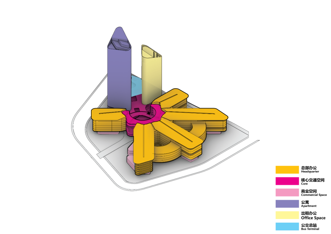Plot A is comprised of the headquarters and supporting functions. Based on the principles of TOD, the design layout is expressed with a core traffic space around which other functions are distributed. The building is composed of five radial office building modules, extending to the riverside from a central open-air plaza. Each office module contains supporting facilities including service business, indoor basketball court and annular open-air courtyard to generate a work-live dynamic.