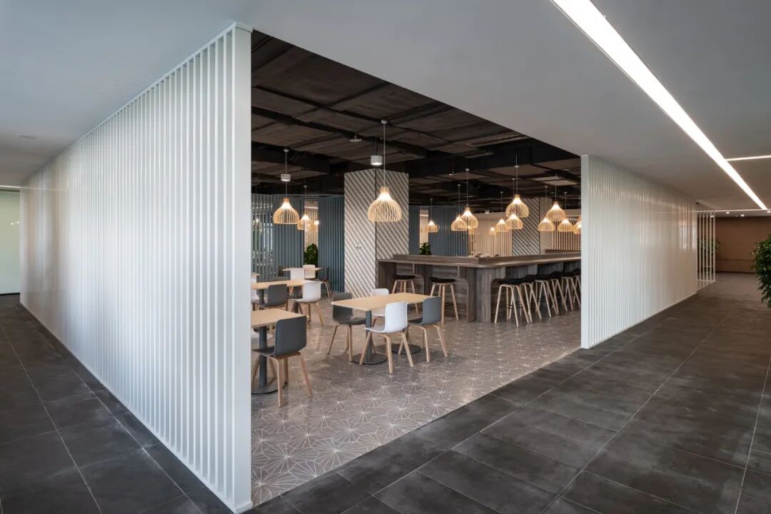 共享办公区内流动的天花弧线犹如叶脉一般,被紧紧联结并向上生长。餐厅区域设置孔雀蓝的铝制格栅,结合不同明度的灰色地砖、沉稳的木饰面以及形状奇特的灯具,各种利落流畅的线条运用其中,形成彼此呼应而又统一的美感。