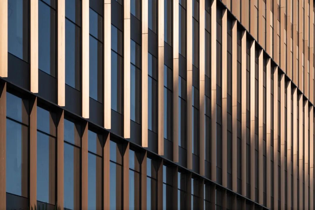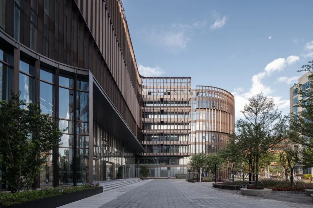 北侧作为建筑主要的形象展示面,延续玻璃外墙的同时,搭配古铜色的细长型立面格栅,塑造简洁大气的科研建筑形象。
