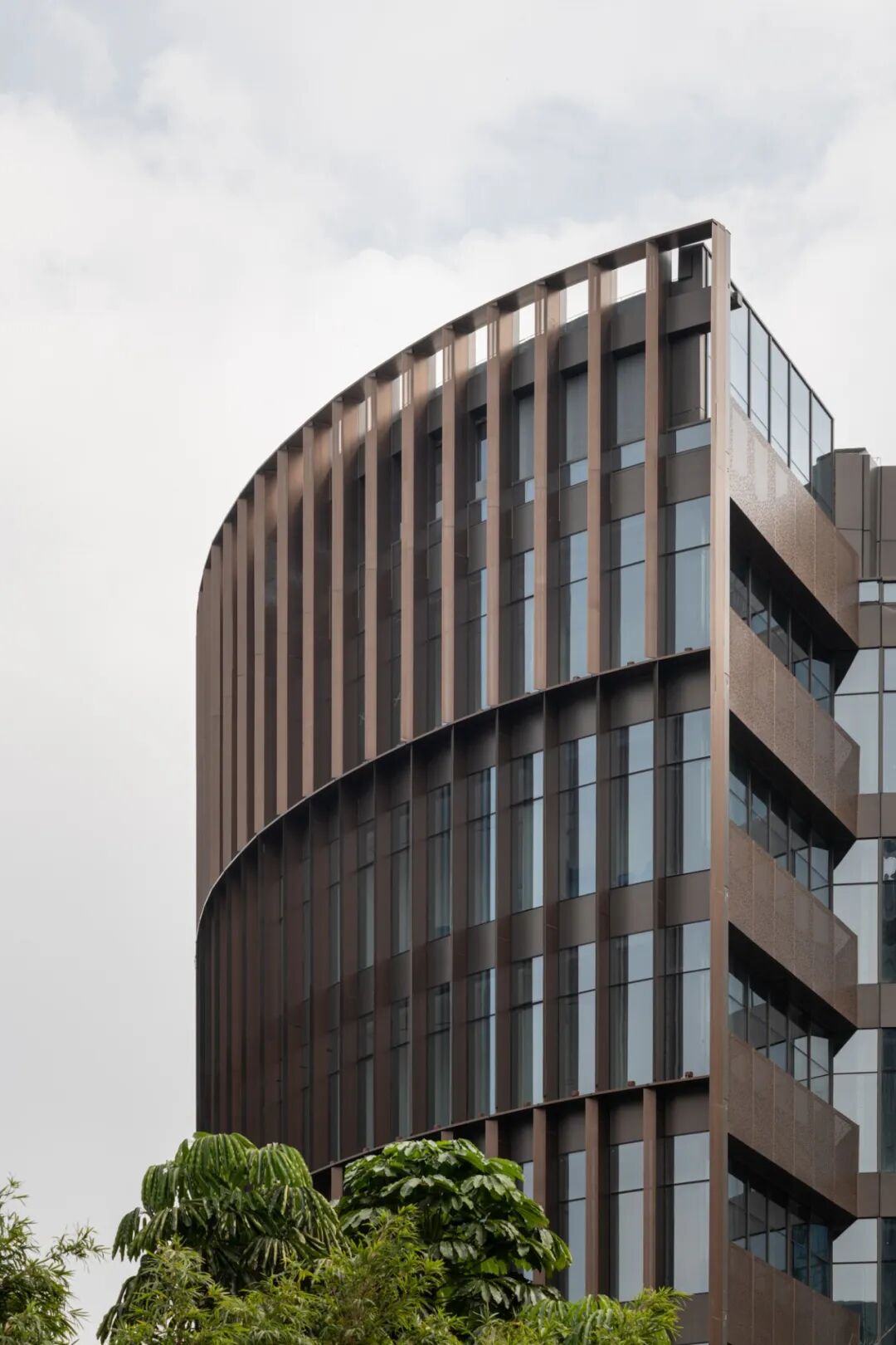 南侧采用30%密度的立面格栅,西侧则加大格栅密度,调整至70%,避免因与相邻办公楼过近造成的隐私问题。不同密度的格栅巧妙地处理了建筑外观的虚实关系,顺应复杂的形体,使建筑形象更加轻巧生动、坚实有力。