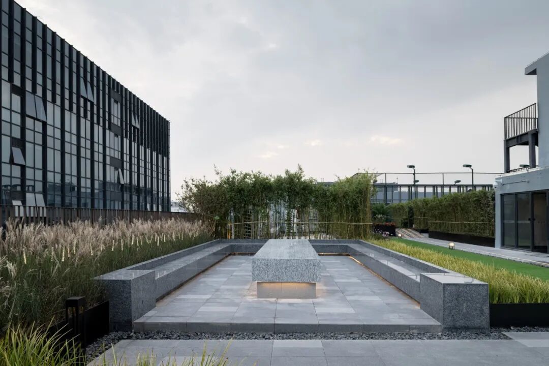 景观沿袭建筑风格,提取建筑表皮竖向肌理延伸至地面,实现场地风格的高度统一,打破了单一的线性空间状态,将路线的“设计”权归还给每位使用者,增加人们偶遇、交流的频率,打造人文、共享的绿色庭院。